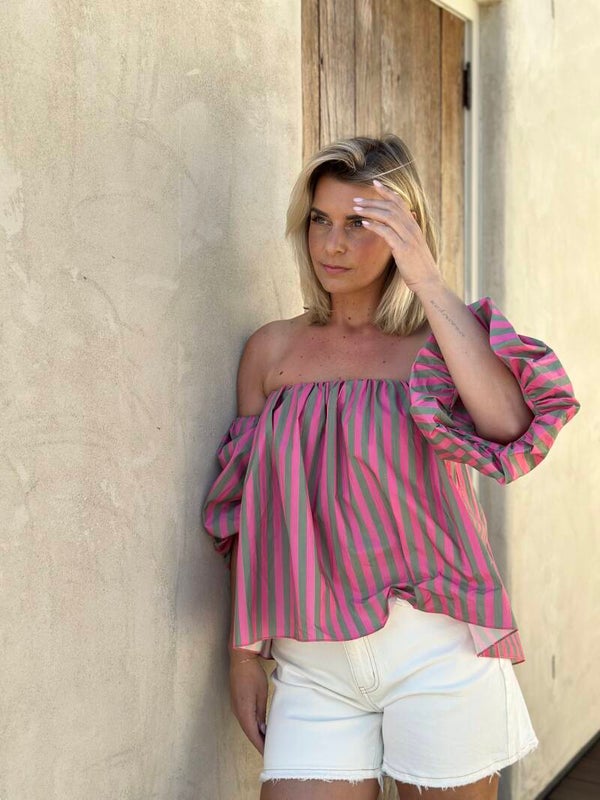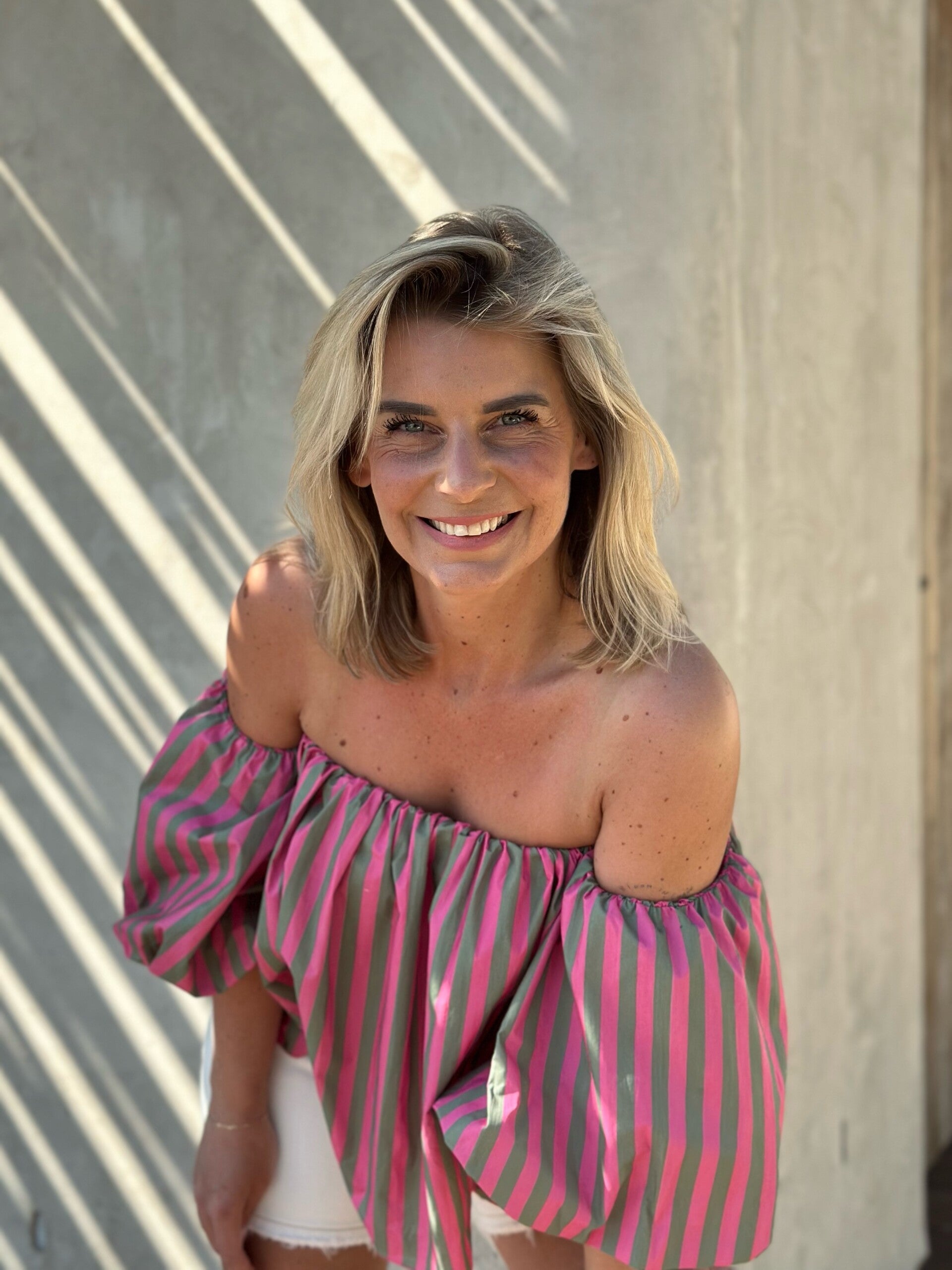 Wauwwww wat een plaatje is dit! Prachtige off shoulder top in een roze met groen streepje. Mega leuk op jeans of wit en perfect voor een feestje, etentje, festival en zelfs bruiloft! (combineer met lichte pantalon, hakje en gouden sieraden!) Zit heel lekker en blijft ook goed zitten, geen geheis dus! kan zowel over de broek als aan de voorkant een stukje erin.